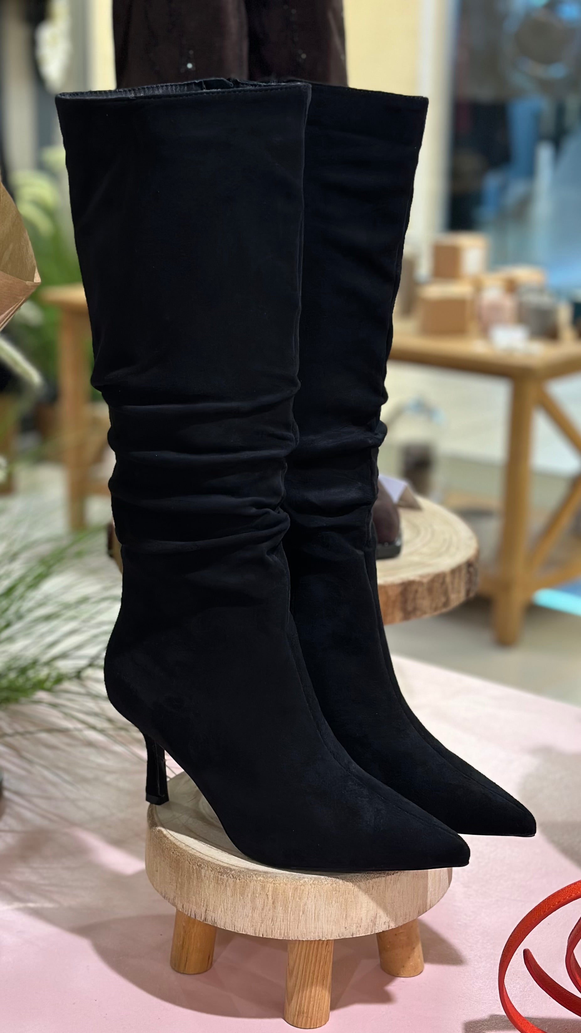 Élégantes et intemporelles, ces bottes en suédine noire séduisent par leur toucher doux et leur silhouette féminine.