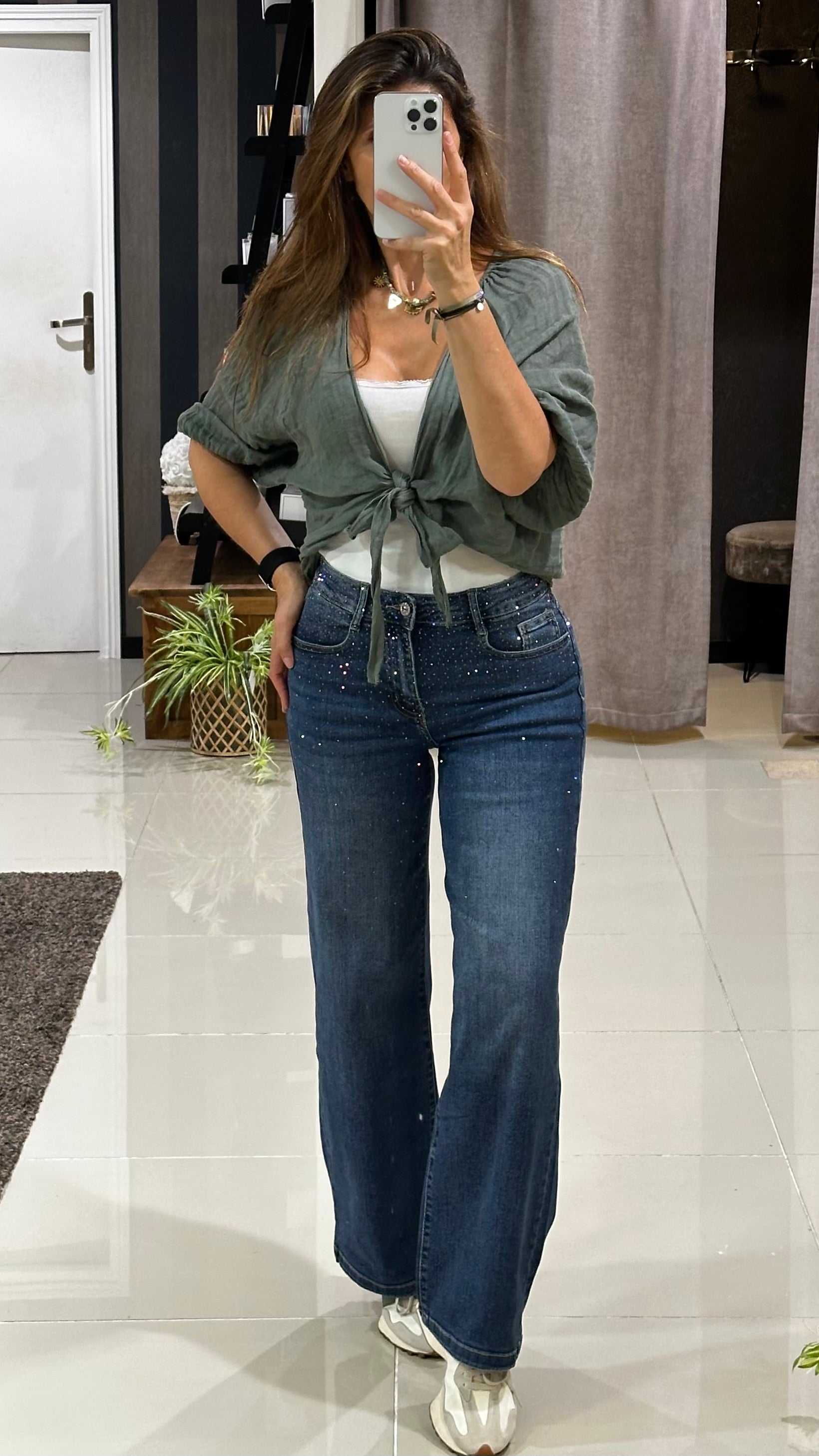 Un denim coupe droite, rehaussé de strass discrets pour une touche lumineuse.