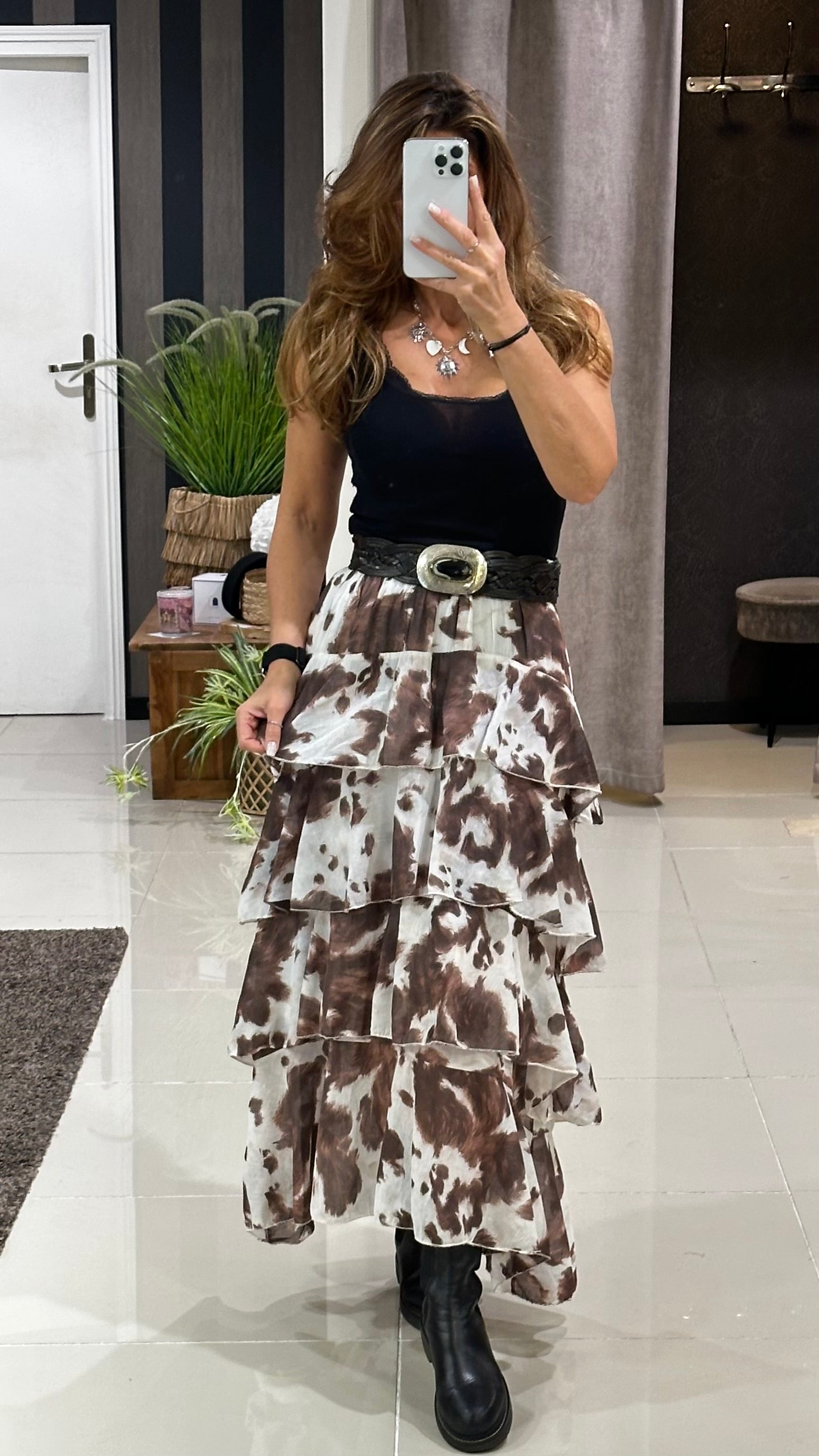 Jupe Longue Bohème à Volants Motif Tacheté Marron & Blanc