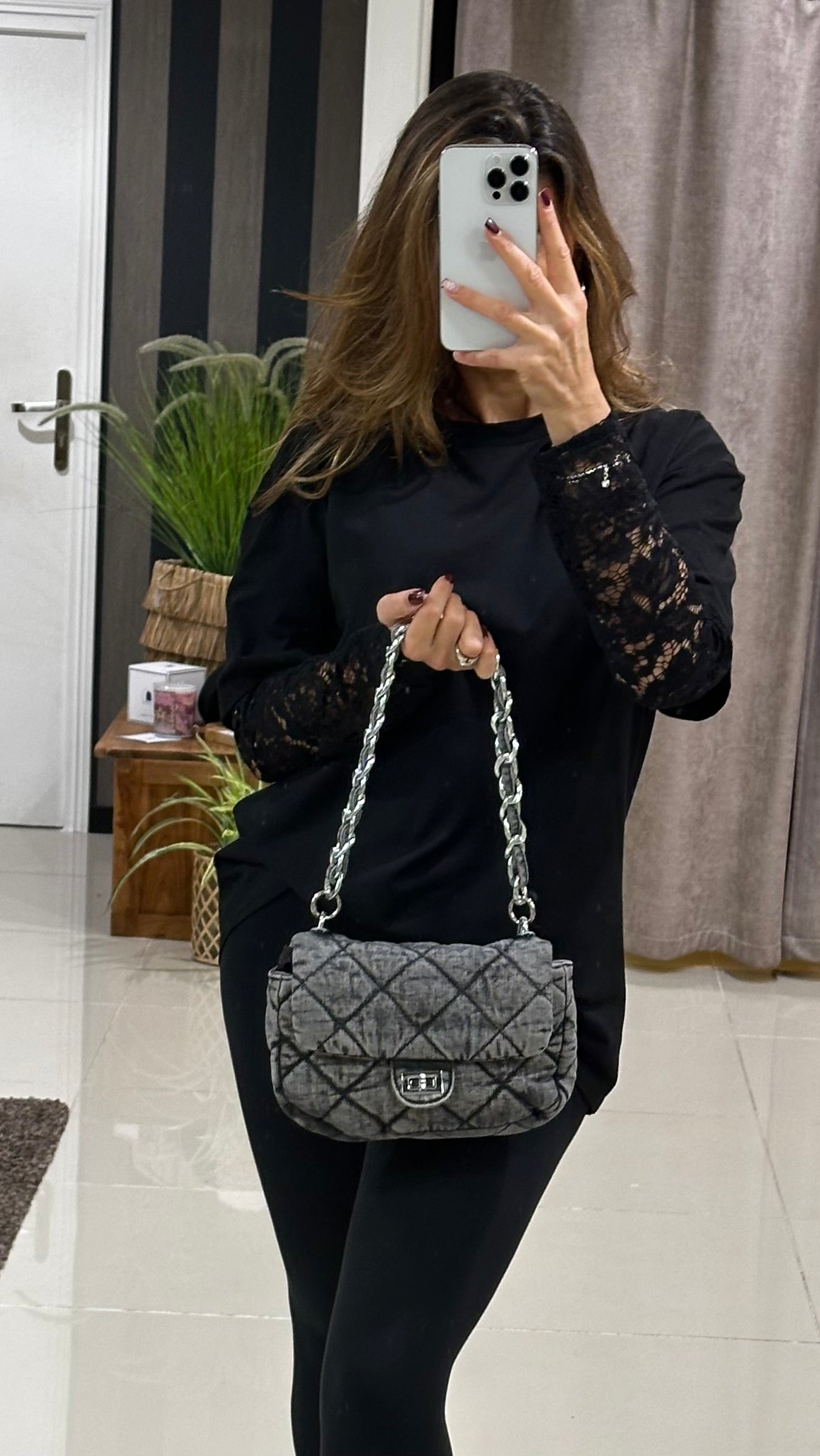 Son tissu en jean gris texturé et ses surpiqûres en losange lui confèrent un style chic et intemporel.