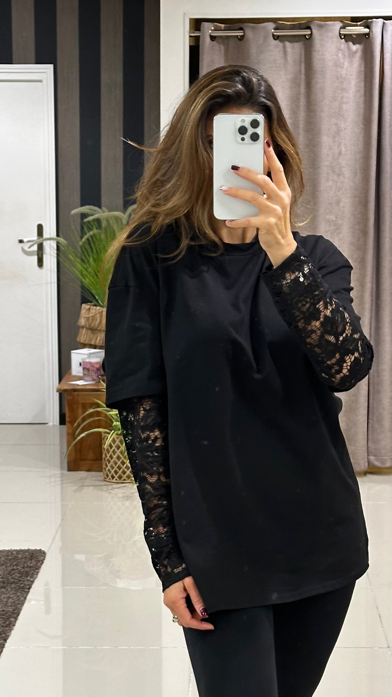 On adore ce T-shirt noir avec ses manches dentelle pour un effet chic décontracté !